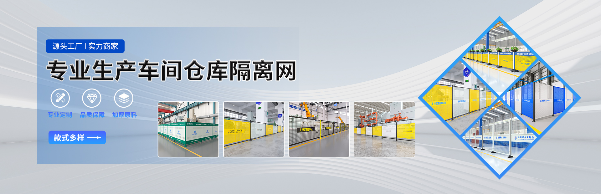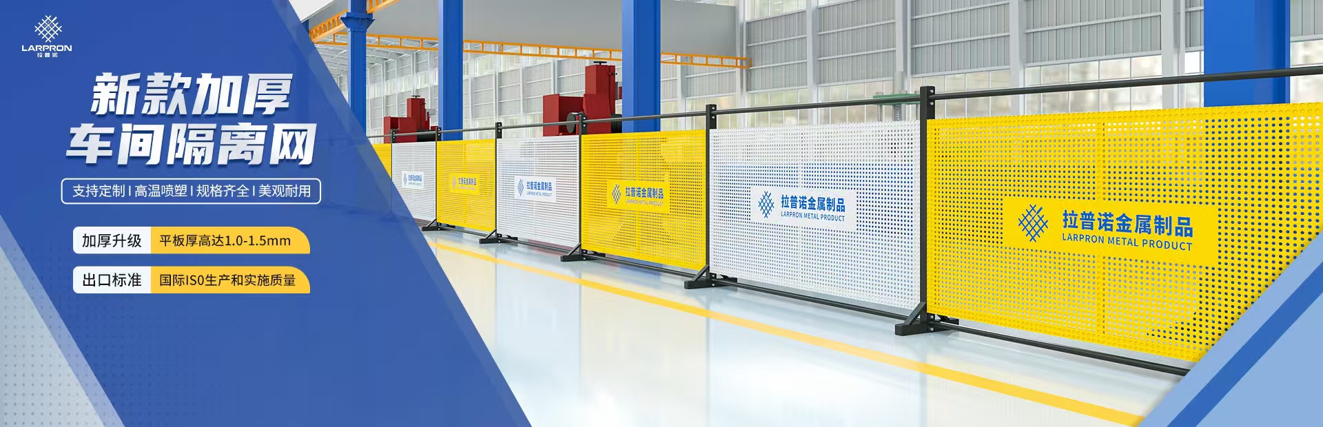 主要产品有:铁丝款隔离网、上网下板隔离网、观光通道隔离网、冲孔板、以及各种炫彩款隔网;建筑用网、机器人护栏、道路护栏系列等安全防护设施、护栏网等系列产品。产品销往全国多个省市,赢得客户厂家的认可。